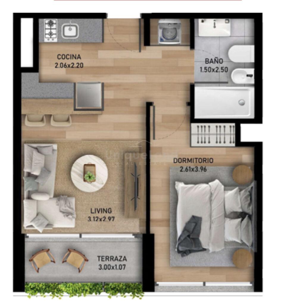 El apartamento cuenta con un dormitorio con placard, un living con salida a la terraza, un baño completo y cocina semi integrada con anafe, con placares bajo y sobre mesada. Se prevee un espacio proximo al baño, para la conexión del lavaropas y el calefón, el cual queda oculto en un placard.