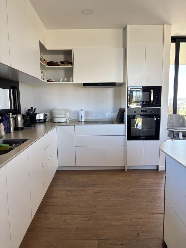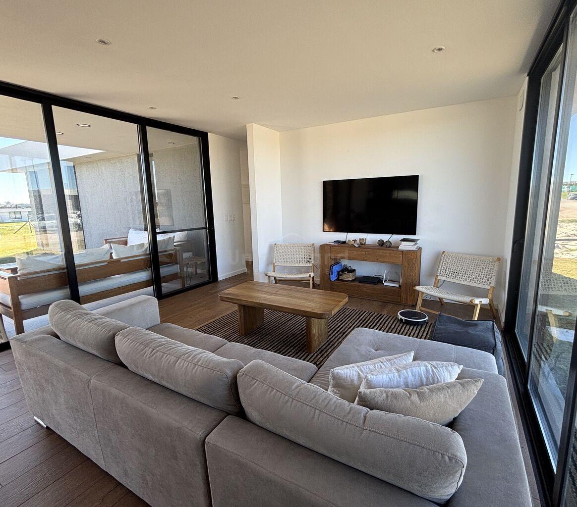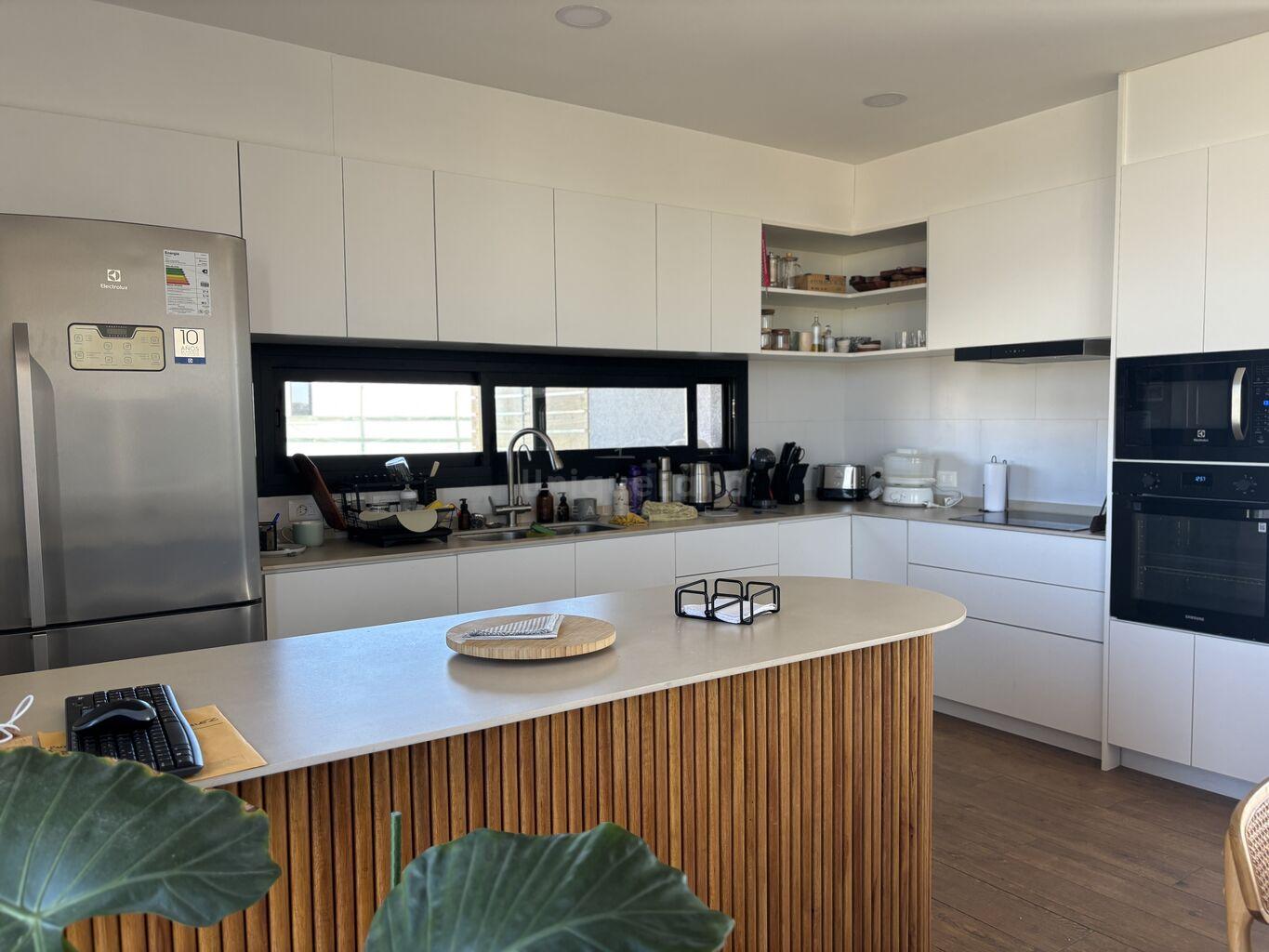 Una vez dentro de la propiedad, nos encontramos con un amplio living-comedor frente/fondo con cocina integrada por una barra de diseño contemporáneo. El espacio que se genera es cómodo, funcional y con muy buena luz natural. El living cuenta con salida hacia la pérgola posterior, la cual cuenta con un parrillero revestido en piedra, una pileta con mueble inferior y una con un anafe eléctrico. Hacia la izquierda del parrillero, se encuentra la sala de máquinas y la zona de lavadero/tender.