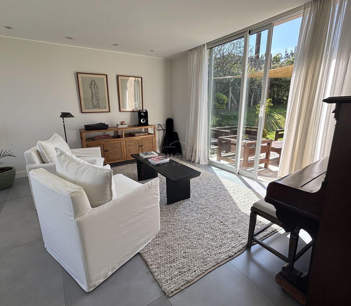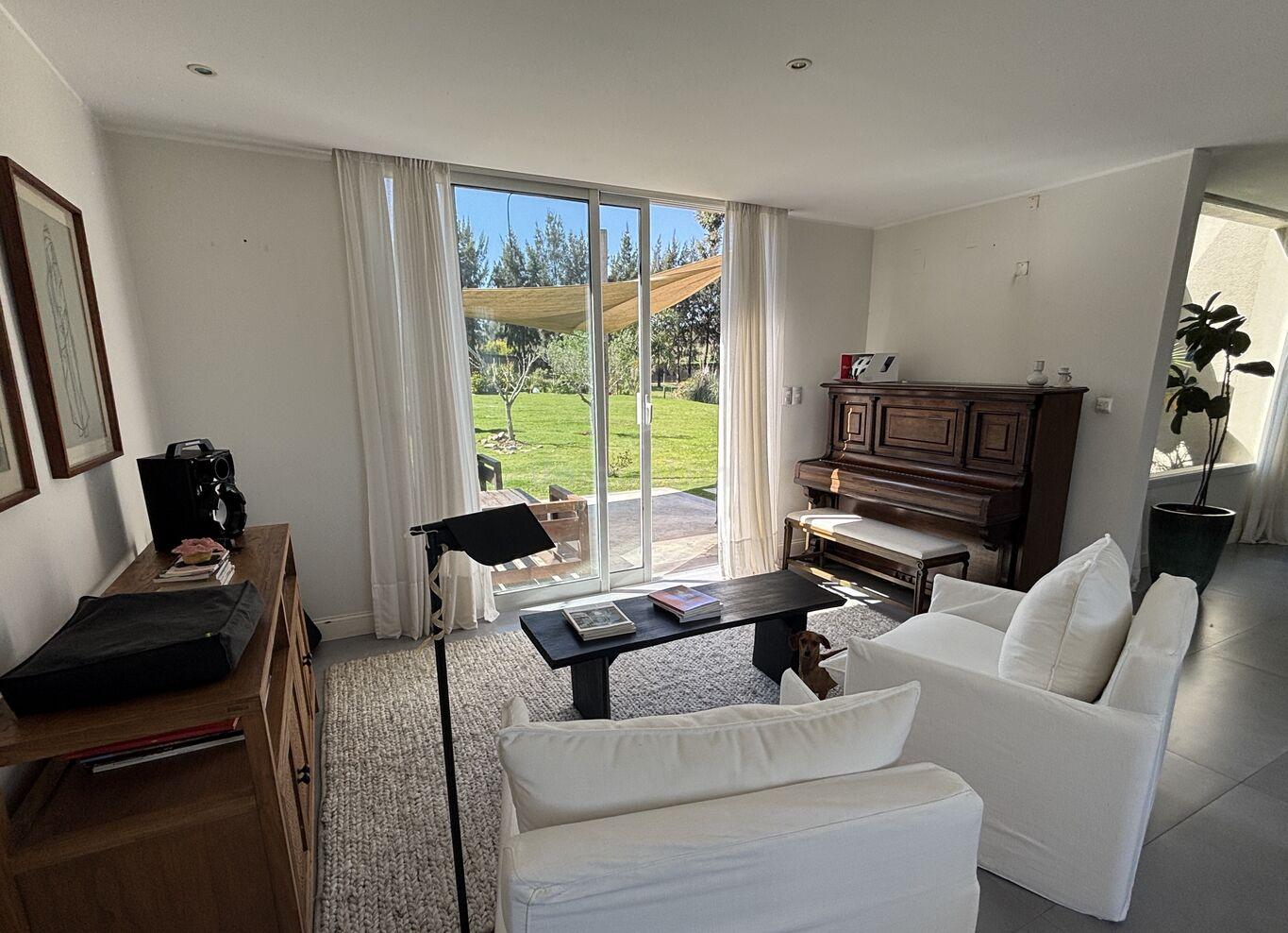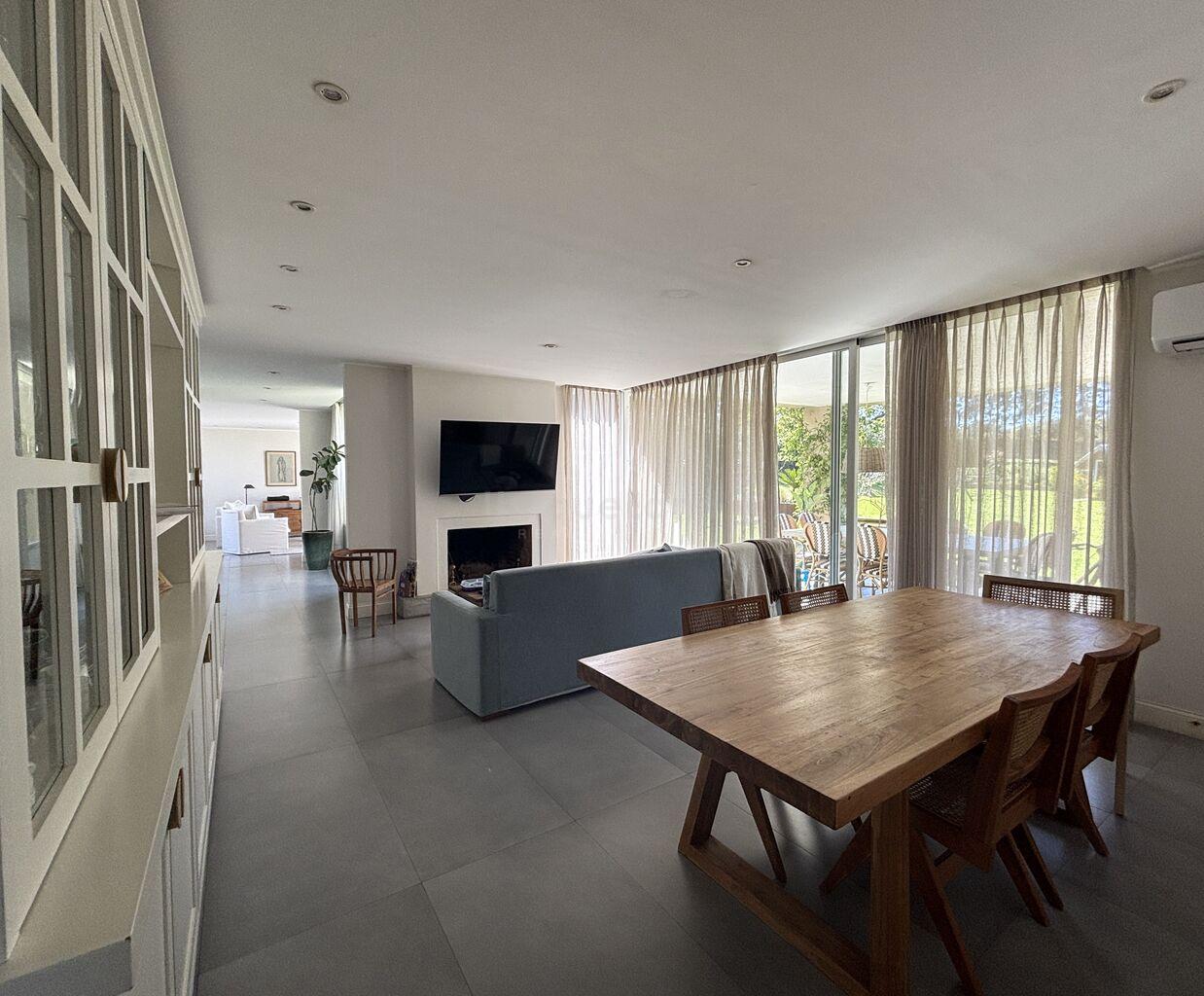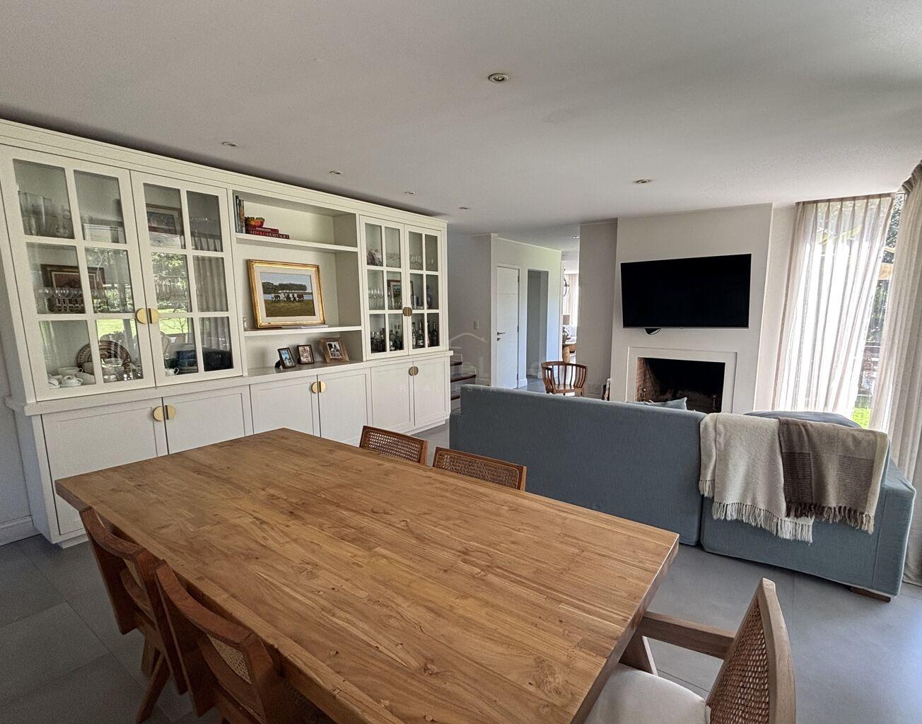 Hacia la derecha del hall recibidor, se encuentra el baño social, un espacio de guardado y el estar, el cual cuenta actualmente con un sector de living y de comedor de uso diario. Este estar cuenta con aire acondicionado, estufa a leña y salida hacia el fondo y a la galería techada, donde encontramos el parrillero con su barra y pileta. Dicha galería tiene aproximadamente 20m2 y vistas hacia un bonito jardín privado. Completa la planta baja la cocina definida con su lavadero integrado, el dormitorio y el baño de servicio.