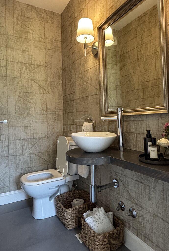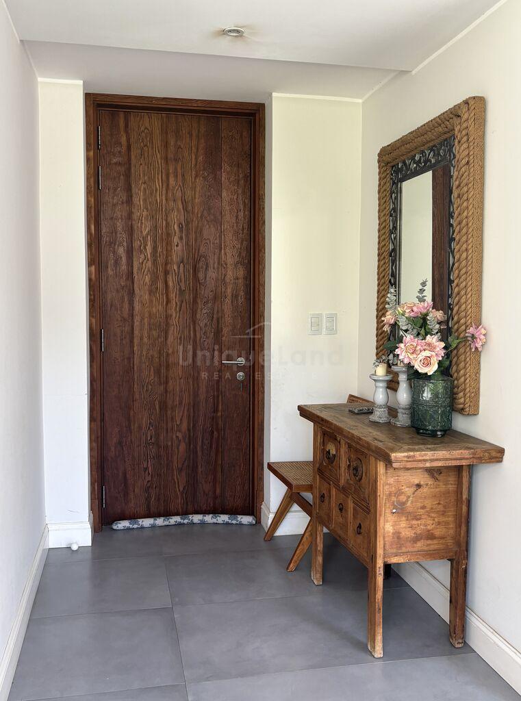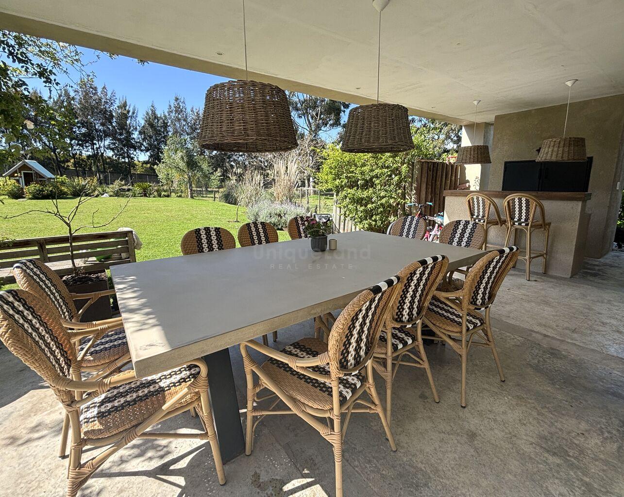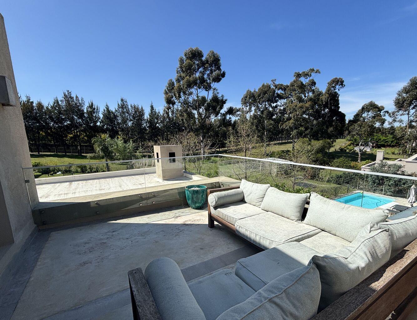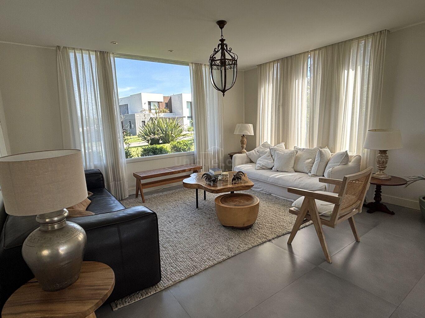 Hacia la derecha del hall recibidor, se encuentra el baño social, un espacio de guardado y el estar, el cual cuenta actualmente con un sector de living y de comedor de uso diario. Este estar cuenta con aire acondicionado, estufa a leña y salida hacia el fondo y a la galería techada, donde encontramos el parrillero con su barra y pileta. Dicha galería tiene aproximadamente 20m2 y vistas hacia un bonito jardín privado. Completa la planta baja la cocina definida con su lavadero integrado, el dormitorio y el baño de servicio.