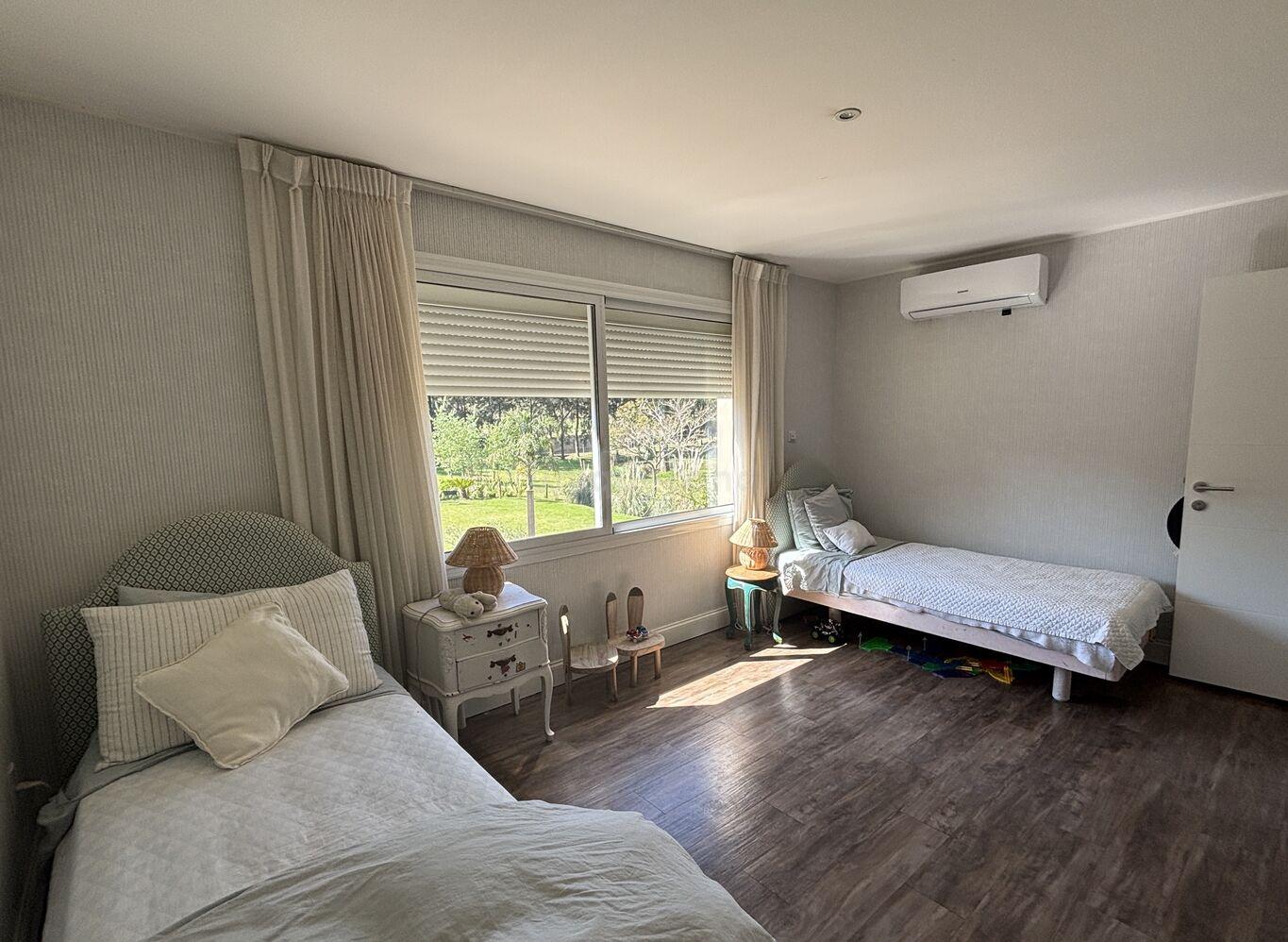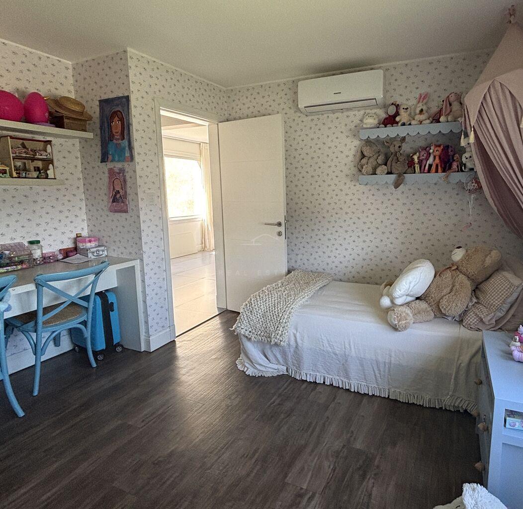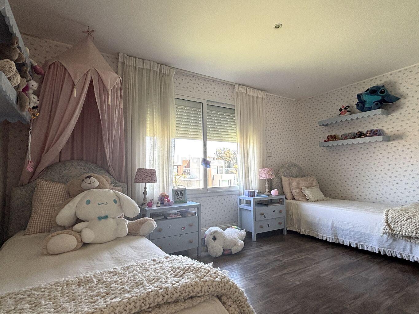 Al llegar a planta alta nos encontramos con otro espacioso hall de distribución con gran iluminación y vistas hacia el fondo de la propiedad. Hacia la izquierda se encuentran dos amplios dormitorios simétricos con placares y escritorio, cortinas de enrollar y aire acondicionado. También se ubica un baño completo espacioso y con ventilación e iluminación natural.