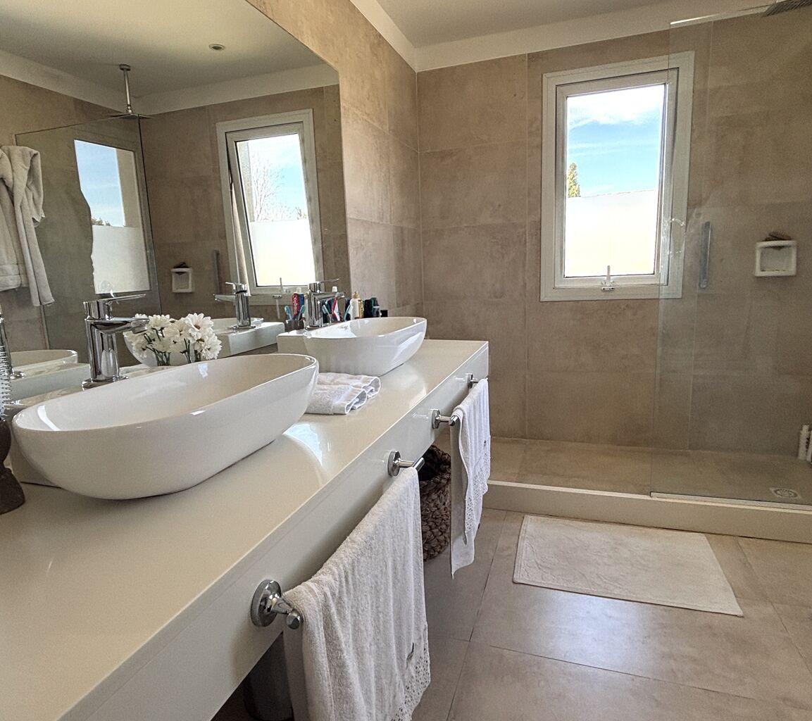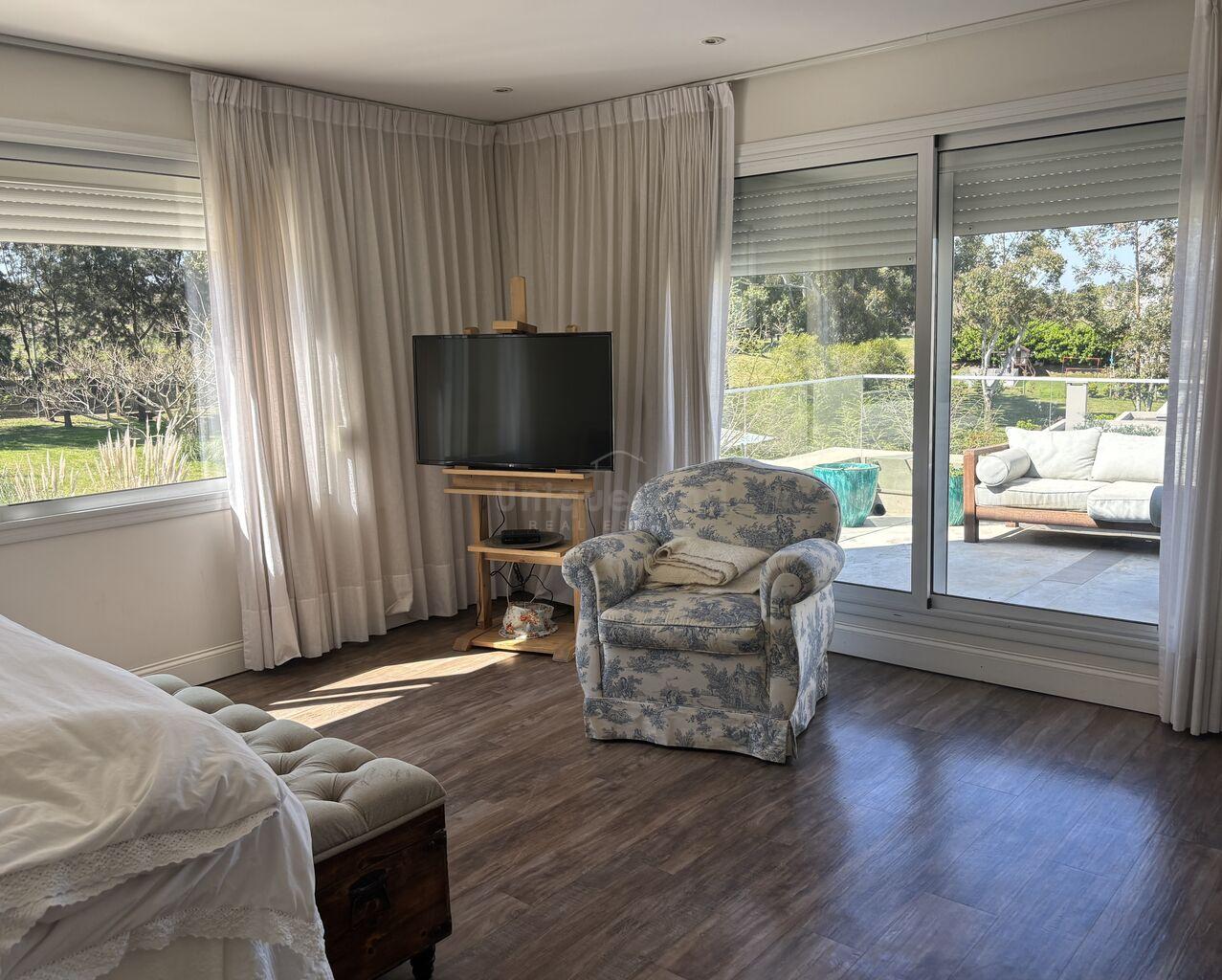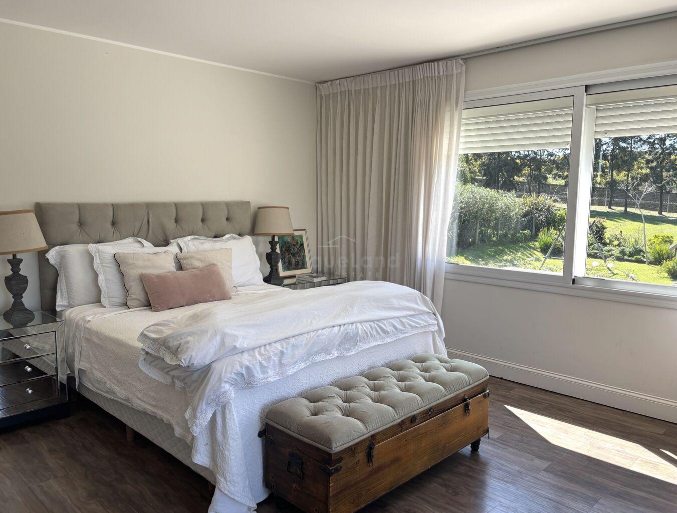 Hacia la derecha se ubica una amplia suite principal de aproximadamente 20m2, la cual cuenta con vistas hacia el jardín privado de la propiedad, es muy luminosa y hacia el lateral cuenta con una terraza transitable. El dormitorio principal cuenta a su vez con vestidor y un amplio baño completo, cómodo y con iluminación y ventilación natural.