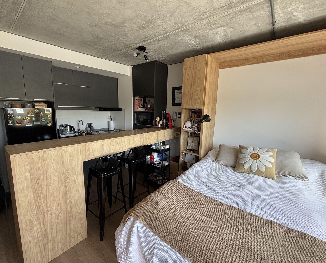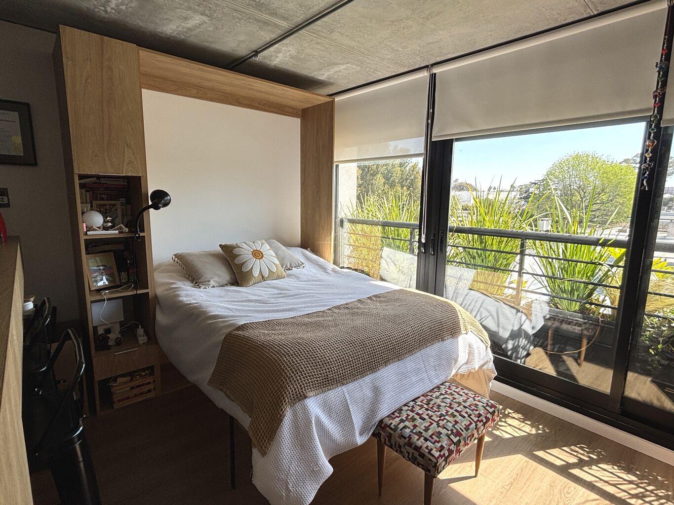 La unidad consta de un living funcional con amplios ventanales con vidrio DVH, cortinas de enrollar de PVC, mosquitero y rollers marca BORK. En dicho espacio se encuentra un aire acondicionado inverter, un placard de madera para guardado de ropa y una cama rebatible diseñada especialmente para este espacio, la cual se integra a un mueble de madera con estantes y cajon. Dicha cama es práctica, funcional y se pliega con facilidad optimizando el espacio del ambiente.
