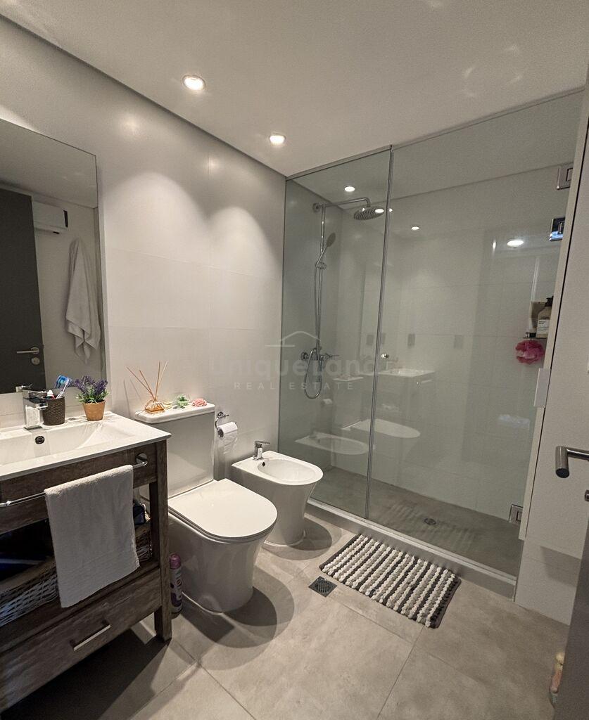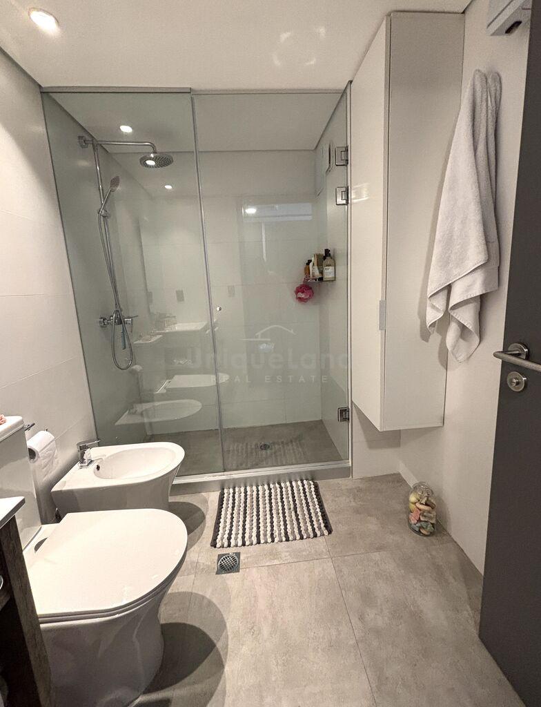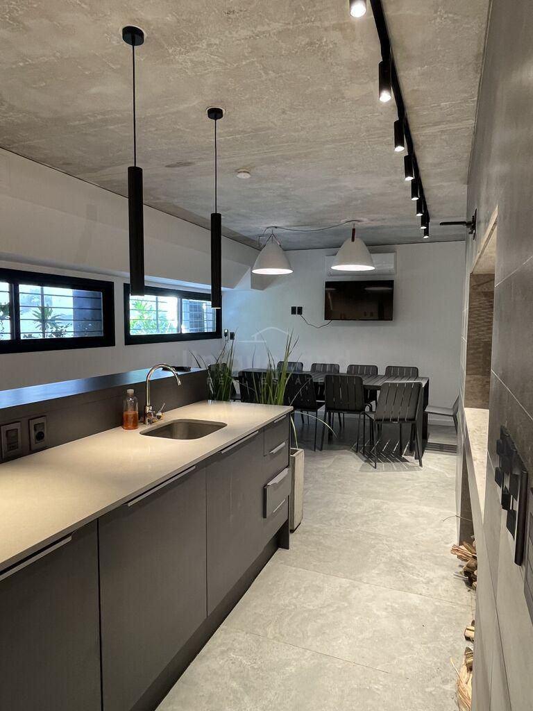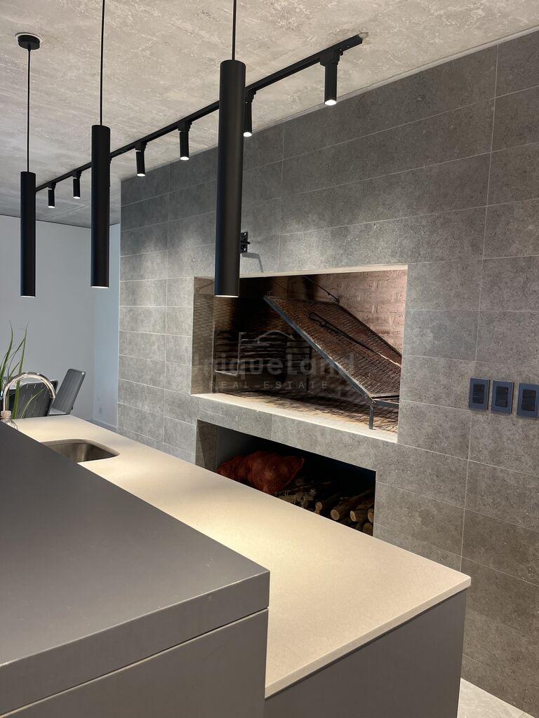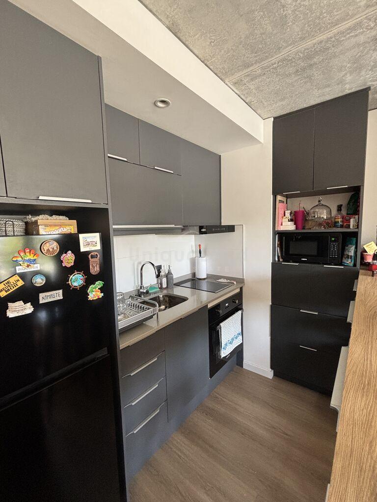 La cocina se encuentra integrada al living por una barra de diseño con espacio de guardado. En la cocina encontramos muebles áreos y bajo mesada; Y otro mueble de piso a techo con espacio de guardado. La unidad esta equipada con heladera, horno empotrado, anafe, campana empotrable, pileta de cocina y calefón de 60L.