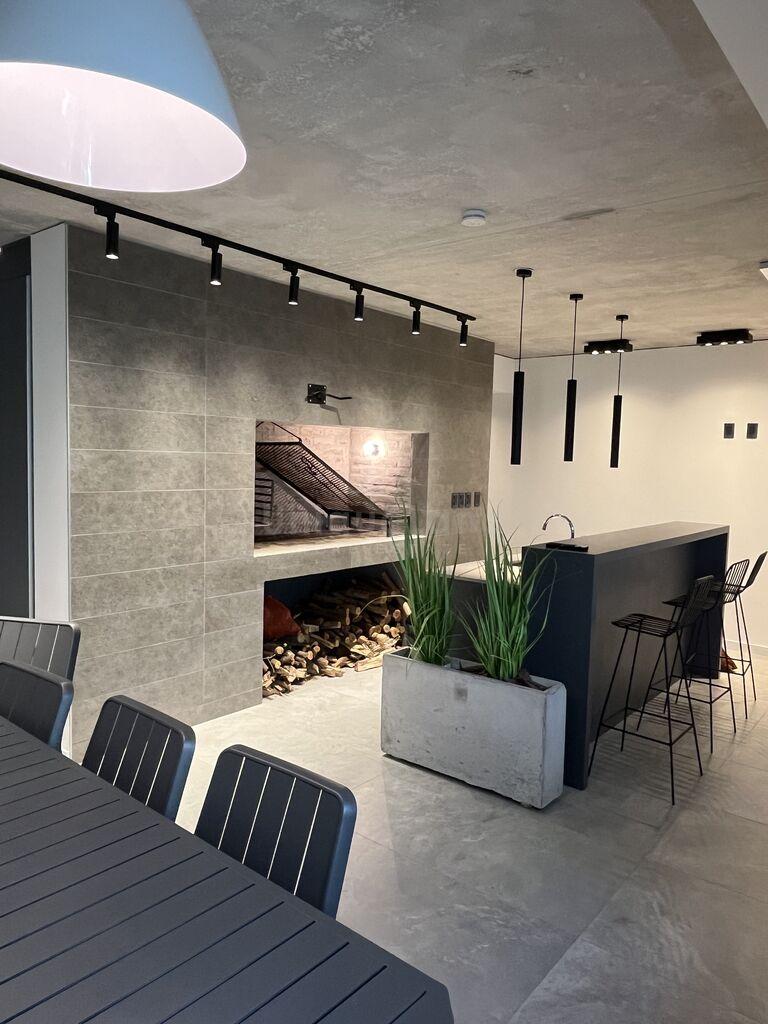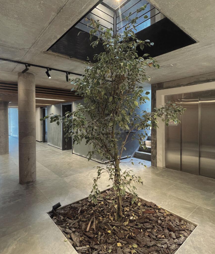 El acceso principal a Cathan se encuentra a nivel de subsuelo, y cuenta con un amplio hall con buena iluminación y presencia de verde, barbacoa o SUM (salón de usos múltiples), lavadero común y estacionamiento cerrado para autos y bicicletas.